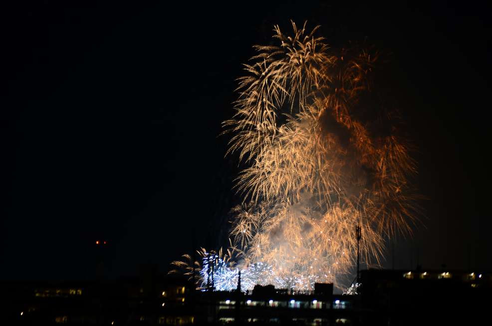 どこかの花火大会が部屋から見えた! はじめは見てるだけだったけど、これってもしや撮れる…?と思って大急ぎで三脚を立てて撮影。
